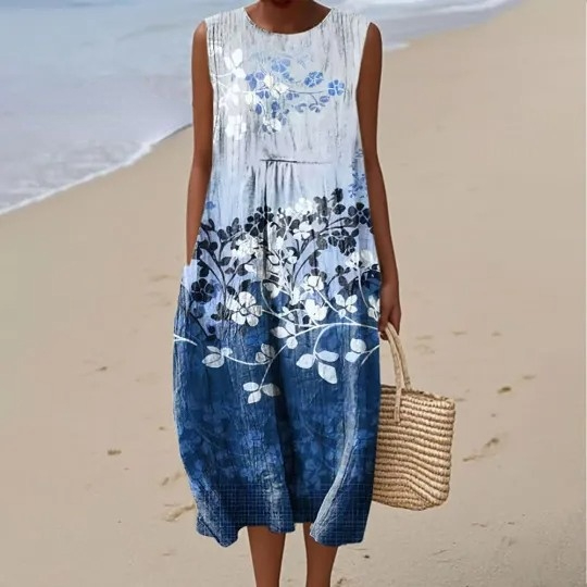 Women's Vintage Flower Art Print Sleeveless Cotton Pocket Wrap Dress